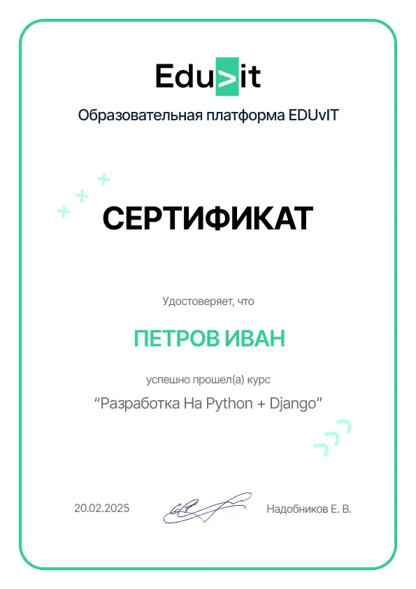 Для получения сертификата необходимо получить положительные оценки по всем домашним заданиям курса. В конце курса вам откроется раздел «Сертификат», откуда можно будет скачать документ.